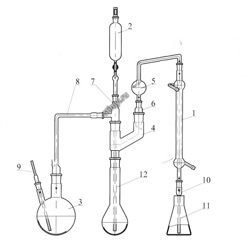Прибор поставляется с комплектом запасных частей, в который входят колбы Кьельдаля вместимостью 250 и 500 мл, колба КГУ-2-1-100-29/32, каплеуловитель, насадка, изгиб и трубки. Прибор для определения азота в органических соединениях состоит из: